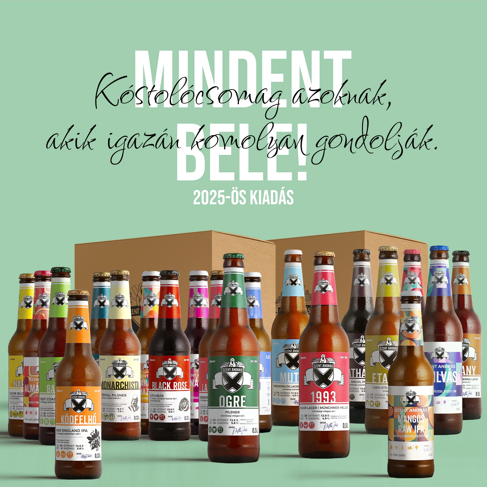 Kóstolócsomag azoknak, akik igazán komolyan gondolják! A Szent András Sörfőzde kínálatában közel 40 féle sörtípus megtalálható és a Mindent bele! sörpakkban a főzde állandó kínálatából közel minden sört megtalálsz. A kóstolás során pedig garantáltan megtalálod a kedvenceidet és nem maradnak el a nagy hümmögések sem.