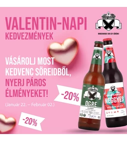 A Valentin-napi ajánlatunkban a résztvevő akciós termék mellett két egyedi limitált kiadású, külön erre az alkalomra összeállított sörválogatást találsz, amiket most 20% kedvezménnyel szerezhetsz be. Koccintsatok a szerelmetekre prémium válogatásainkkal, amelyekben izgalmas Szent András söröket találtok. Hiszen együtt felfedezni őket még különlegesebb élmény.